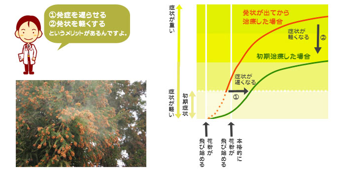 初期療法とは、花粉が飛び始める前、もしくはむずかゆ症状が少しでも現れた時点から薬を服用する治療法です。
